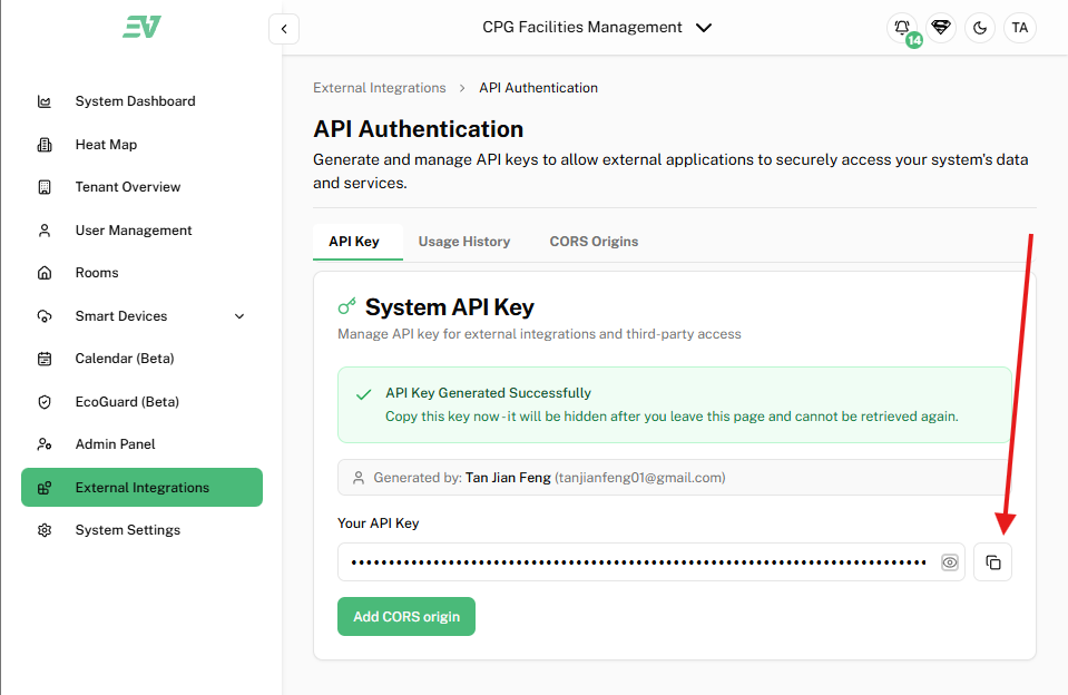 Once the key is generated, copy it immediately. You will not be able to view the key again for security reasons. Store it securely, such as in an environment variable or a secret management system.