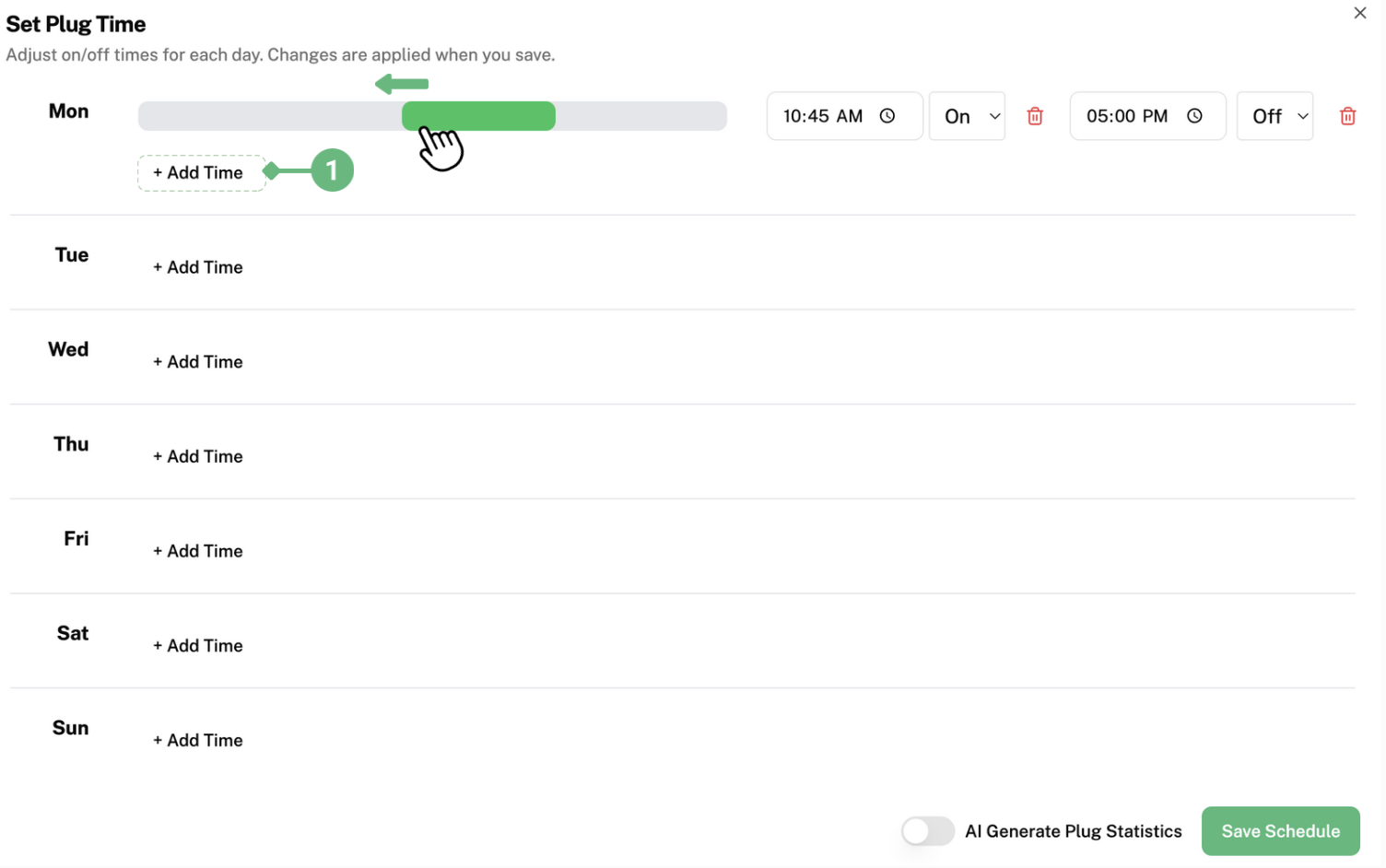 For example, the picture shows the green bar being dragged to the right, so that the plug will be turned on at an earlier timing. The green bar represents the duration the plug is turned on for.