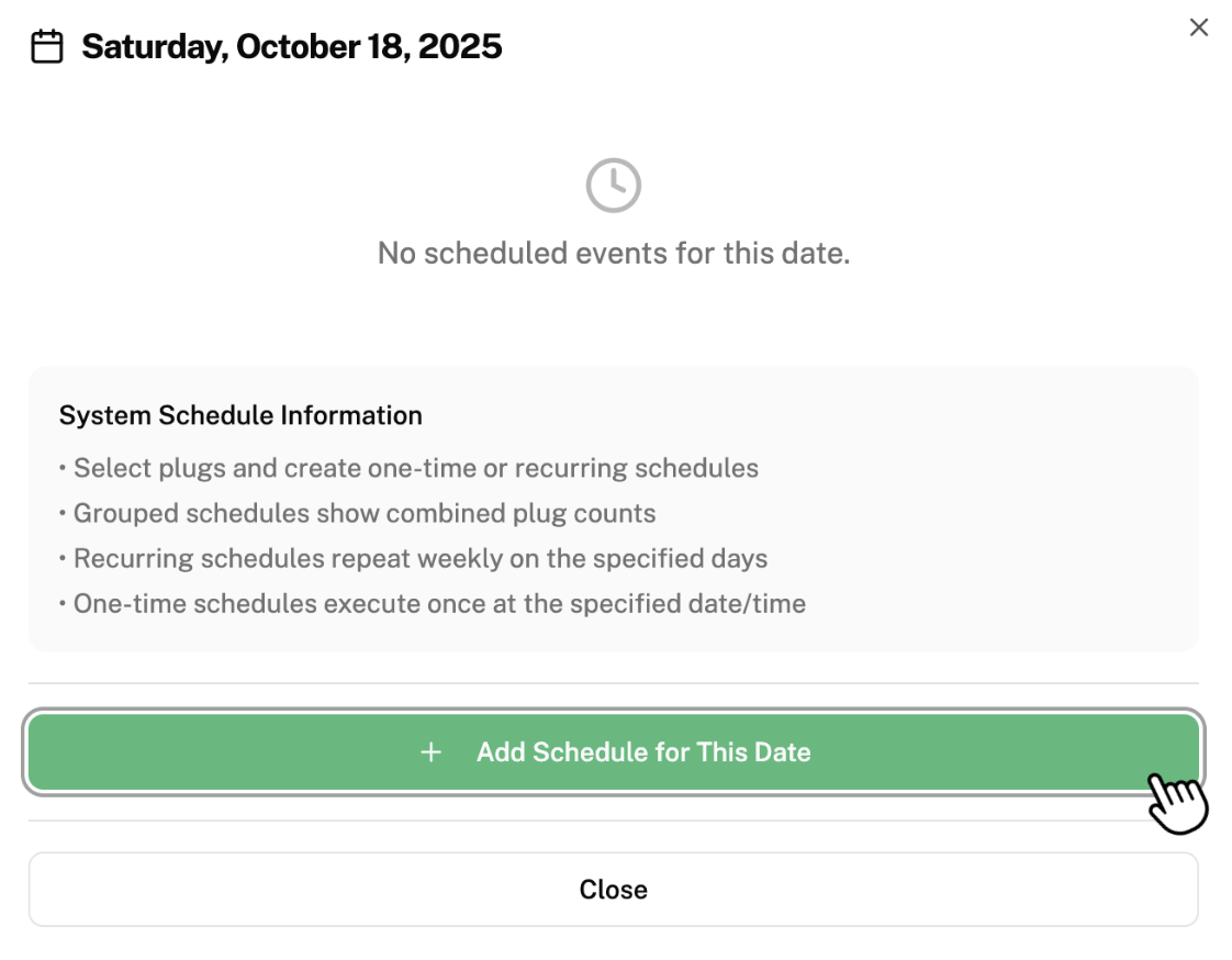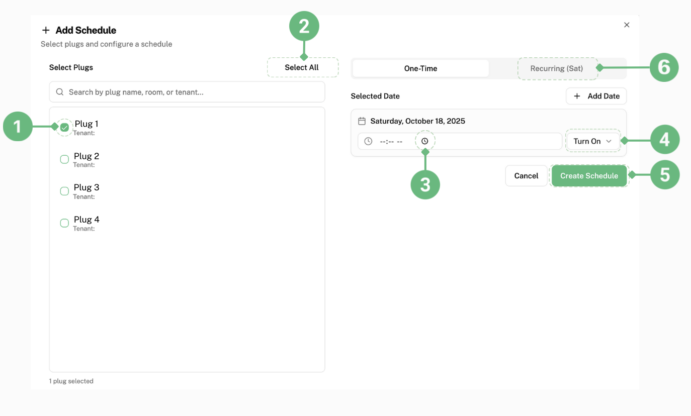 To set a schedule for all the plugs in your system on this date, click on "Select All" labelled as 2.