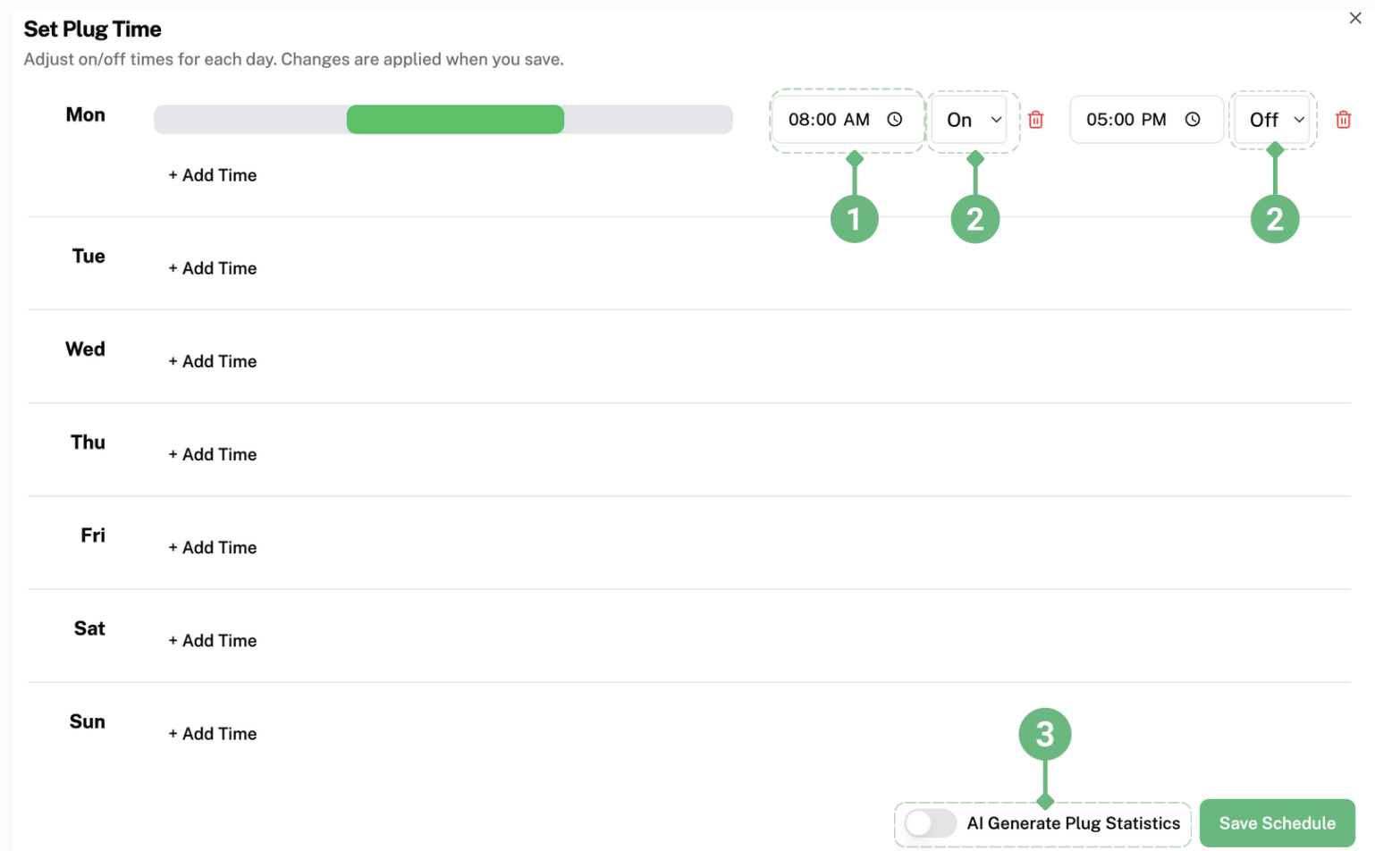 After dragging the green bar to the right, the starting time has been changed from 10:45am to 8am as shown in label 1. You can decide which time you want the plug(s) to be turned off or on by clicking on the boxes labelled 2. Typically, users set the plugs to be turned on during office hours.